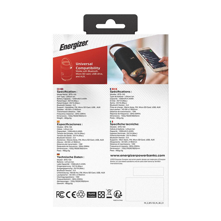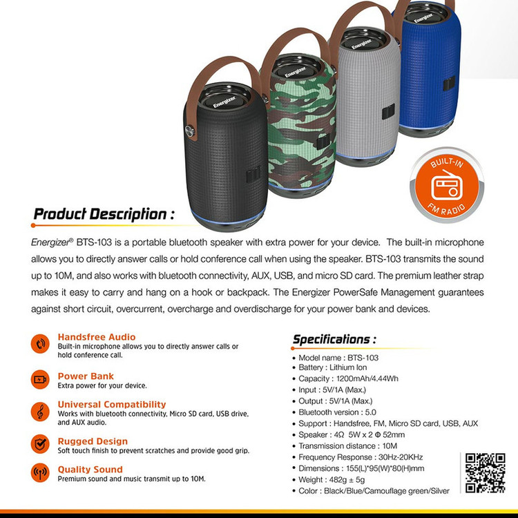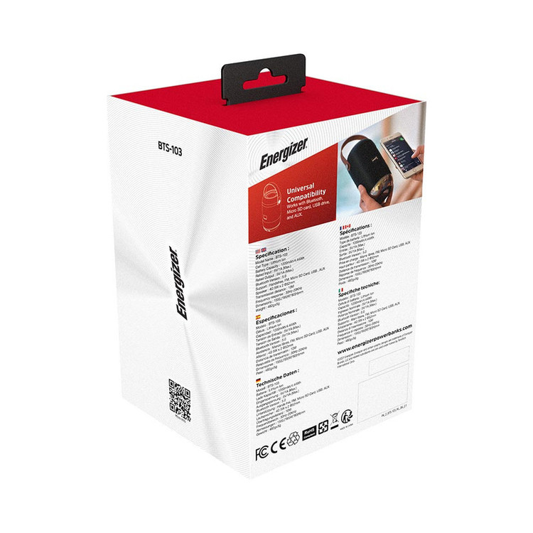 اسپیکر بلوتوث BTS103 از دیگر محصولاتی است که به تازگی توسط کمپانی انرجایزر به بازار عرضه شده است. این اسپیکربلوتوث که به صورت یک استوانه طراحی شده است از همین دست اسپیکرها است. طراحان این مدل همزان راحتی کاربری و زیبایی را در آن پیاده کرده اند در راستای بالا بردن رابط کاربری محصول با قرار دادن یک بند چرم به فکر راحتی حمل و نقل آن بوده اند. همچنین مدل ایستاده آن باعث میشود این محصول هنگامی که بر روی میز قرار میگیرد، جای کمی بگیرد. بر روی اسپیکر یک روکش پارچهای با تنوع رنگی بالا و طرح خاص ارتشی با الهام از طبیعت و جنگل استفاده شده است. در قسمت انتهایی آن روکش فلزی استفاده شده است تا آسیبی به اسپیکر وارد نشود همینطور دکمههای کم و زیاد و جستجو و پاور در قسمت جلویی این بخش و پورت های USB ،AUX و ورودی کارت میکرو و درگاه شارژ MicroUSB در قسمت پشتی آن است. کمپانی انرجایزر در استفاده از این محصول کاملا دست شما را باز گذاشتهاند و با ایجاد تمامی امکانات در آن تلاش نمودهاند تا محصولی زیبا و بینقص را به بازار عرضه دارند.
