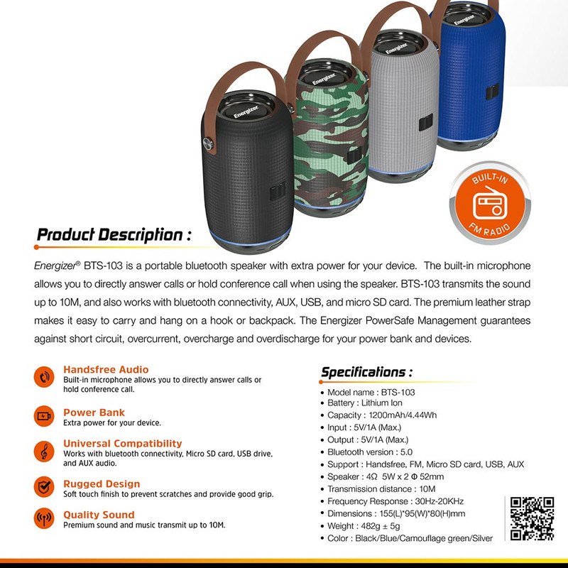 اسپیکر بلوتوث BTS103 از دیگر محصولاتی است که به تازگی توسط کمپانی انرجایزر به بازار عرضه شده است. این اسپیکربلوتوث که به صورت یک استوانه طراحی شده است از همین دست اسپیکرها است. طراحان این مدل همزان راحتی کاربری و زیبایی را در آن پیاده کرده اند در راستای بالا بردن رابط کاربری محصول با قرار دادن یک بند چرم به فکر راحتی حمل و نقل آن بوده اند. همچنین مدل ایستاده آن باعث میشود این محصول هنگامی که بر روی میز قرار میگیرد، جای کمی بگیرد. بر روی اسپیکر یک روکش پارچهای با تنوع رنگی بالا و طرح خاص ارتشی با الهام از طبیعت و جنگل استفاده شده است. در قسمت انتهایی آن روکش فلزی استفاده شده است تا آسیبی به اسپیکر وارد نشود همینطور دکمههای کم و زیاد و جستجو و پاور در قسمت جلویی این بخش و پورت های USB ،AUX و ورودی کارت میکرو و درگاه شارژ MicroUSB در قسمت پشتی آن است. کمپانی انرجایزر در استفاده از این محصول کاملا دست شما را باز گذاشتهاند و با ایجاد تمامی امکانات در آن تلاش نمودهاند تا محصولی زیبا و بینقص را به بازار عرضه دارند.